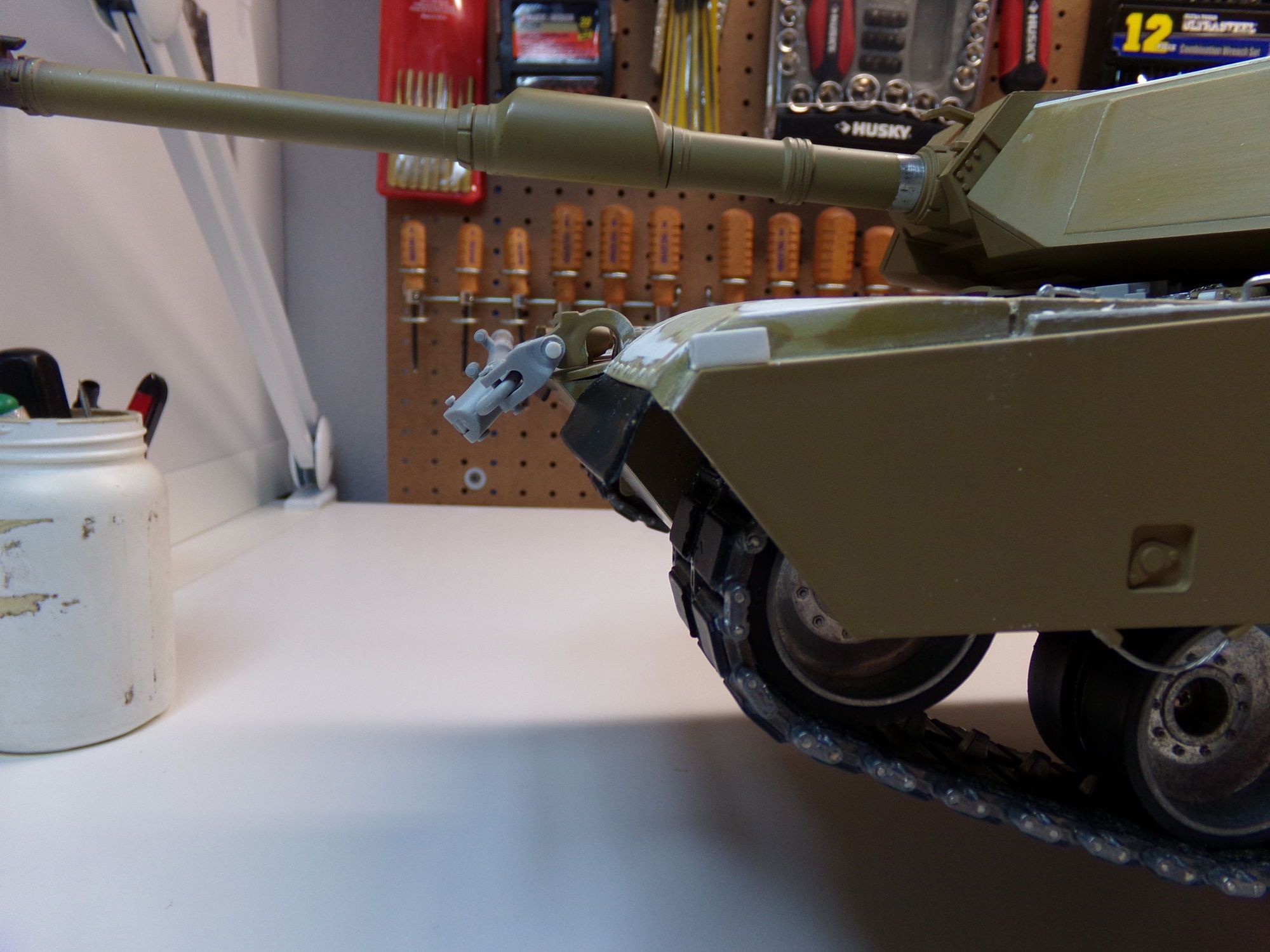 Shot of the vinyl mudflaps that are flexible. Made from some waterproof tape from T-Rex. Basically the tape was folded over on itself as the part you see and then the sticky part of the tape mounts it to the inside of the track well. Footman loop replaced with steel cable and the solid box replaced by a scale hollow one. Bolt detail added to track skirts.